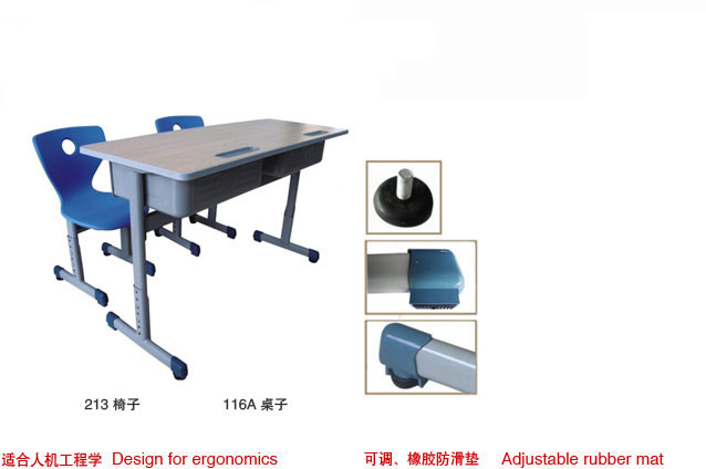 - 雙人課桌臺(tái)面采用三聚氰胺飾面板注塑包邊無(wú)接縫,規(guī)格長(zhǎng)120cm,寬45cm,臺(tái)面厚度為1.8cm,可調(diào)節(jié)高度為66-78cm;