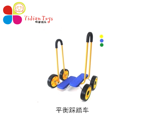 器材介紹:平衡踩踏車是一種手扶踩踏車,有兩個塊踏板、四個輪子和兩個扶 手組成。平衡踩踏車和腳踏車很相似,孩子可以用腳踩是車子隨意前進(jìn)活后退,扶手拆下,大人小孩都可以使用。