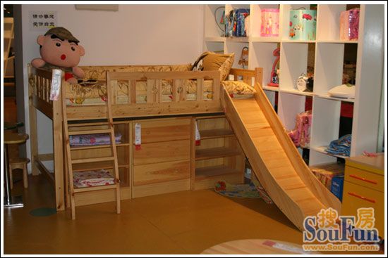 一般兒童家具以為床主,搭配衣柜和書桌,基本沒有其他功能。歡樂空間系列兒童床組合將床、柜子結(jié)合起來,創(chuàng)造性地設(shè)置了一個(gè)小型滑梯,讓這套家具增添了許多趣味;菟杏貌木鶃碜运赡緦(shí)木,幾塊木板拼接起來,基本看不出縫隙。由于松木家具在使用過程中會有油脂溢出,接縫處不易開裂和變形。